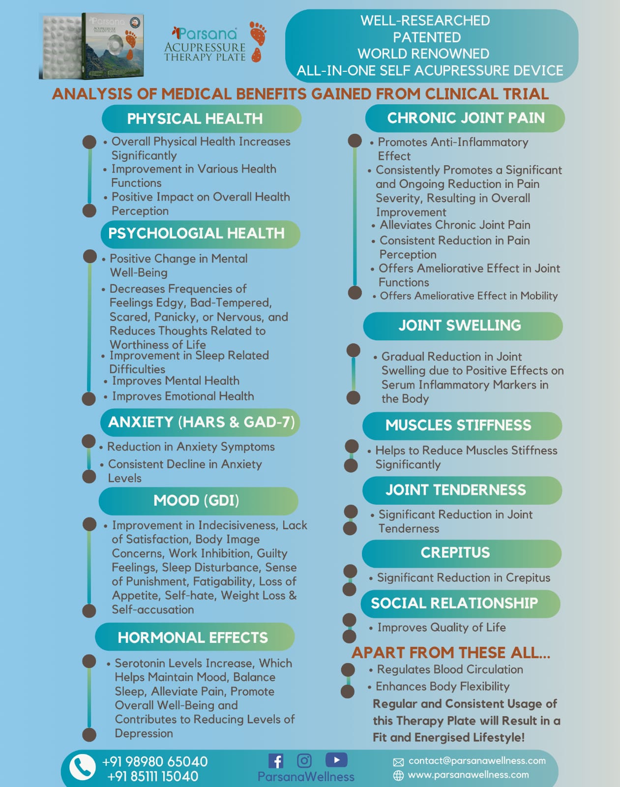 The Parsana Acupressure Therapy Plate offers multiple health benefits for your well-being. Firstly, it effectively reduces stress levels, providing a calming and relaxing experience for your mind. Additionally, it aids in improving digestion and assists with weight management. Using this therapy plate leaves you feeling energized, as it significantly boosts your body's energy levels. Embrace the therapeutic benefits of this plate to enhance your overall health and vitality.